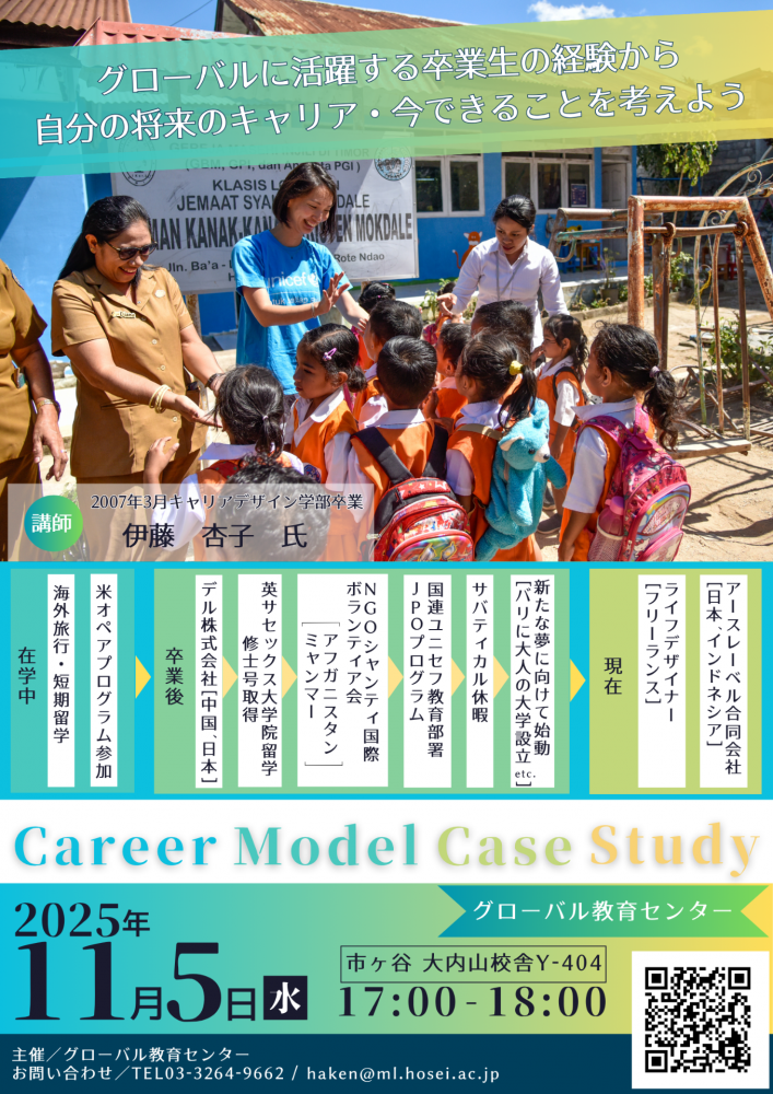 Career Model Case Studyは、在学中にグローバルな体験をした/卒業後にグローバルに活躍している卒業生をお招きし、学生時代の活動や卒業後のキャリアについて講演していただきます。在学生の皆さんが卒業後のキャリアを考え、今後の学生生活を充実したものにするためのヒントを得てもらうことを目的としています。