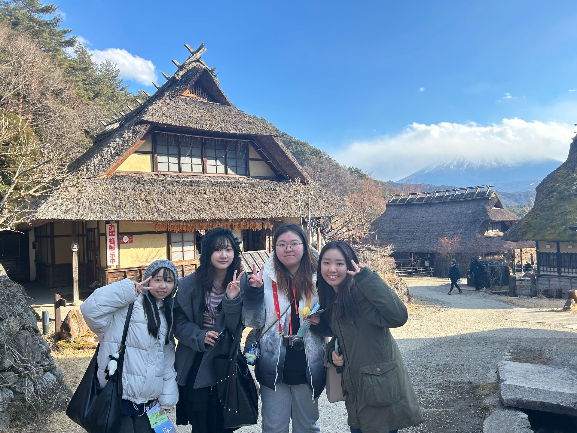 午前中は法政大学の学生ボランティアと共に日本語と日本文化の授業を受講し、午後は文化活動として、着物を着ての浅草散策、深川江戸資料館・清澄庭園見学、つまみ細工作り、アニメ・アフレコ体験を行いました。浅草散策では日本語の授業で習った味の表現や擬音語を使っての食レポなどを行いました。つまみ細工作りでは、「丸つまみ」で梅の花と花火を作成し、苦戦しながらも楽しみました。週末は山梨までバス遠足を実施し、富士山を見て、いちご狩りやほうとう作りなどを行いました。
